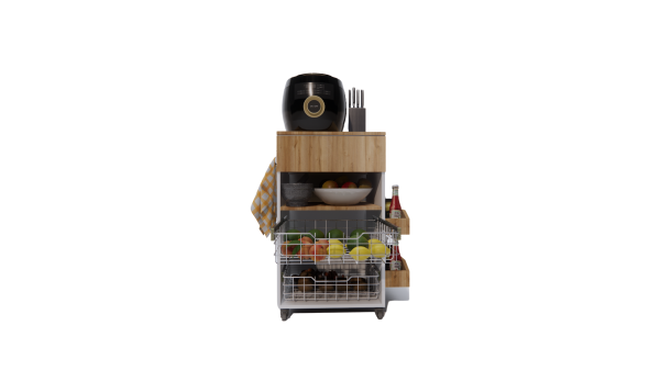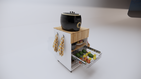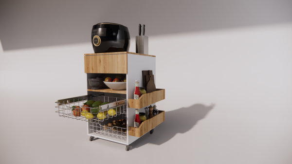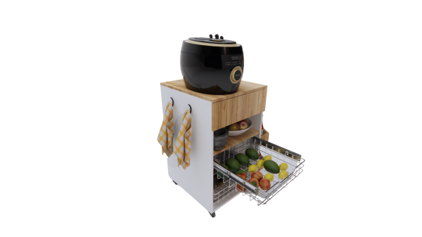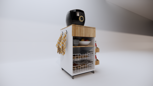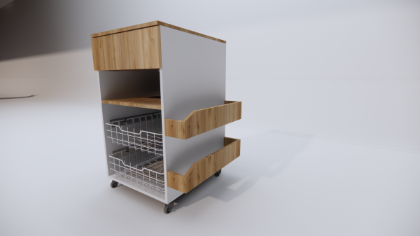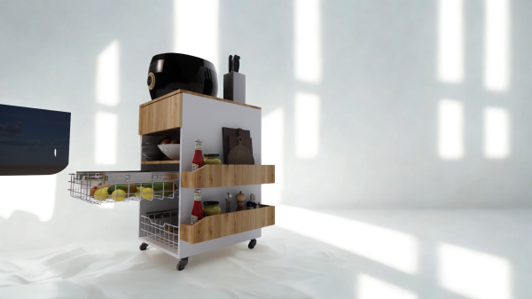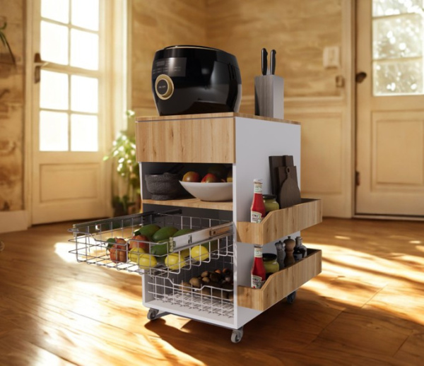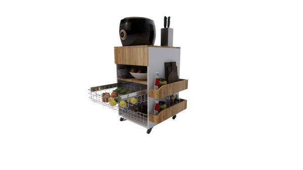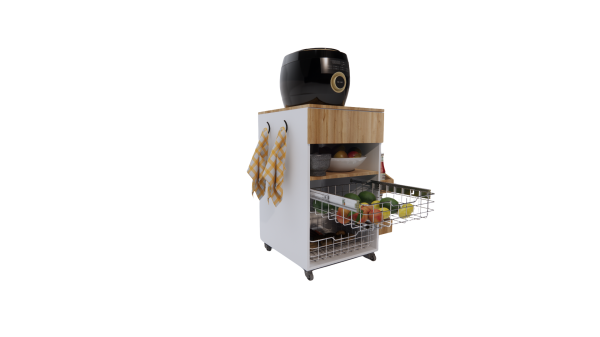 | ROLLBOX – Mueble auxiliar con ruedas Módulo móvil diseñado para optimizar espacios de cocina, cafetería o zona de apoyo. Incluye: • 2 canastillas metálicas para frutas y verduras • 1 cajón superior • 1 repisa central • 2 ganchos laterales para trapos o utensilios • 2 repisas auxiliares para frascos o especias Estructura en melamina de alta resistencia con ruedas giratorias de 360°. |